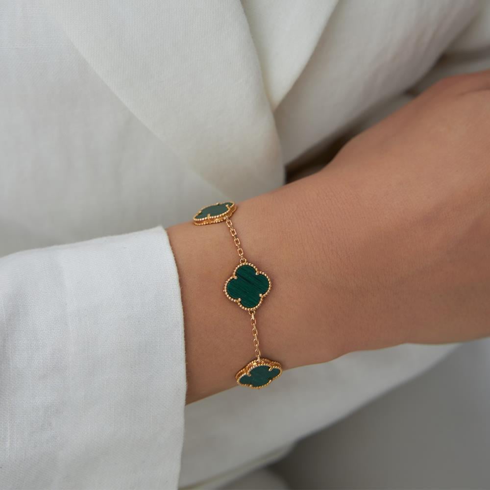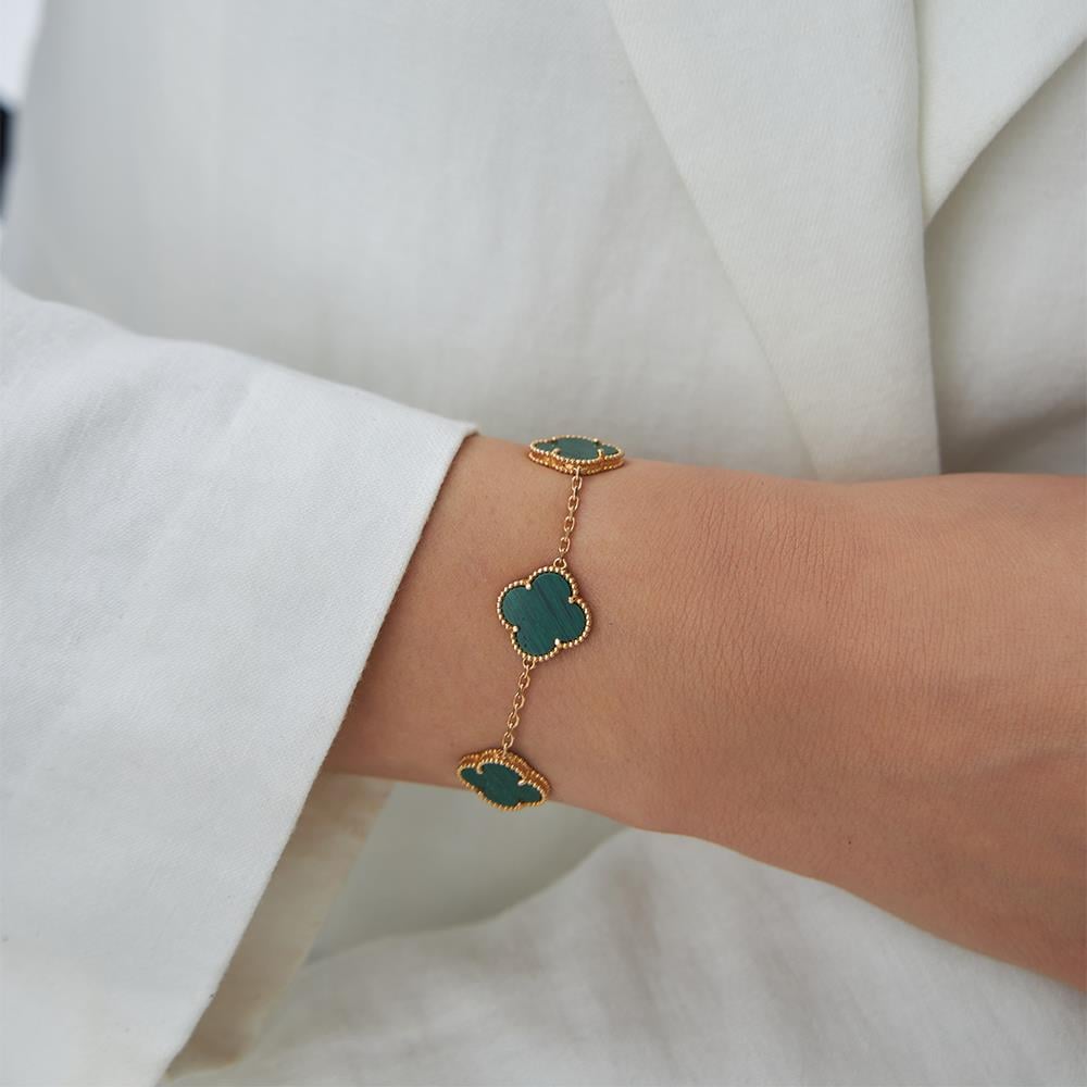 18 Ayar Altın Beşli Yeşil Malahit Taşlı Rose Altın Yonca Bileklik