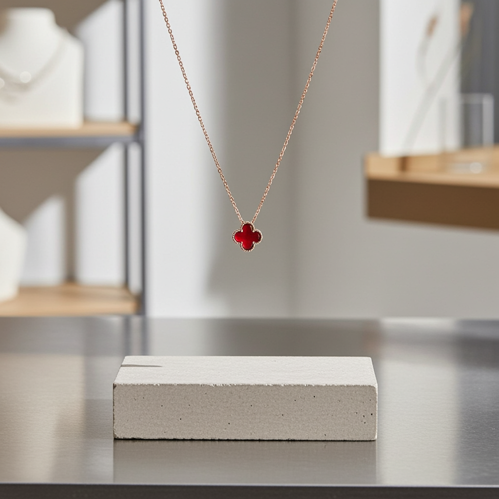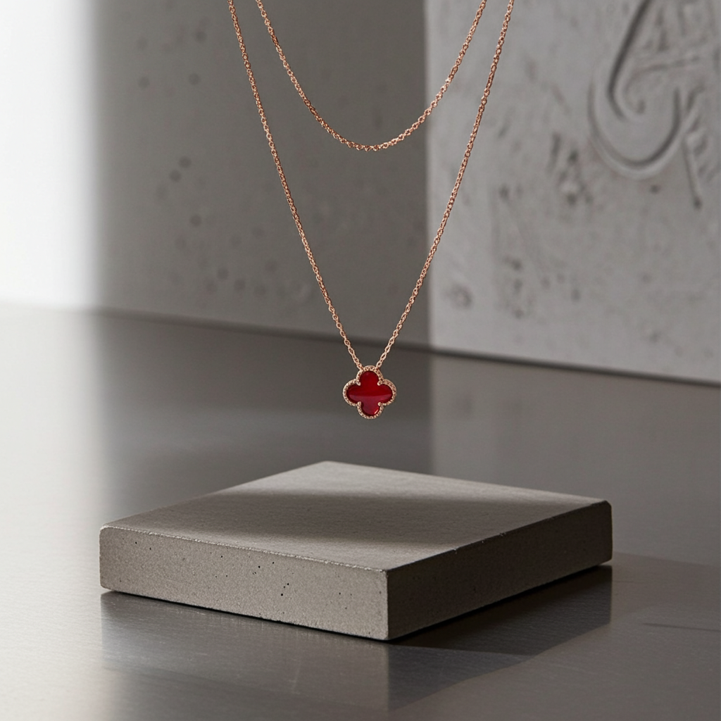 18 Ayar Altın Bordo Taşlı Yonca Kolye