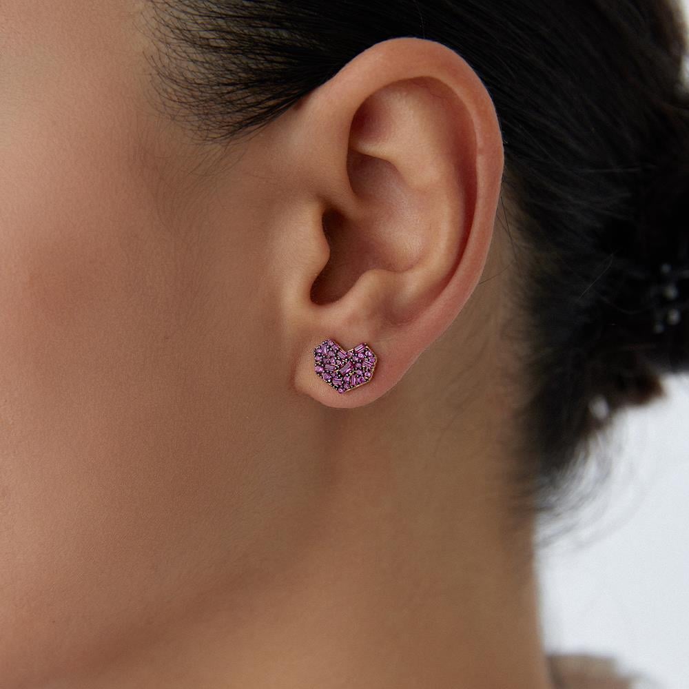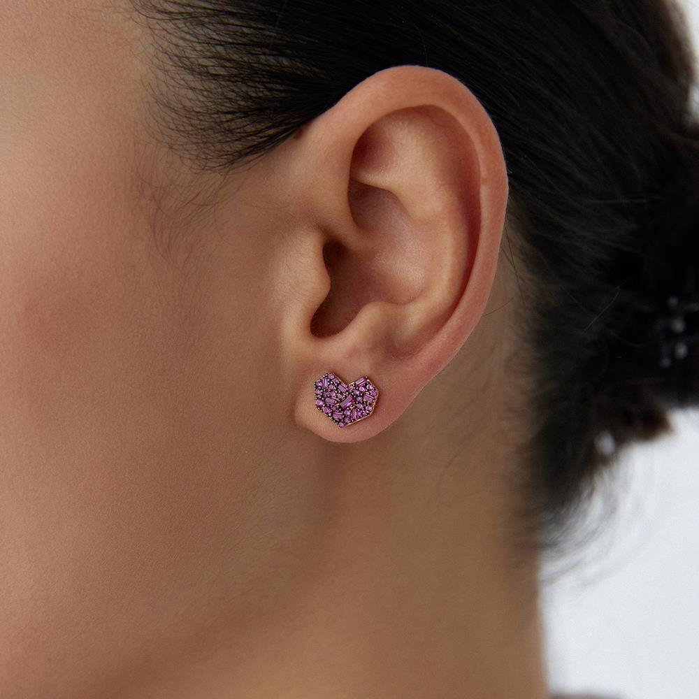 Kırmızı Taşlı Tasarım Minimal Kalp Altın Küpe