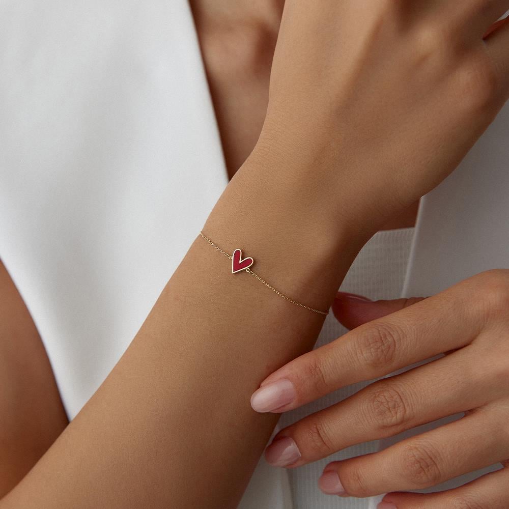 Minimal Kırmızı Mineli Kalp Altın Bileklik